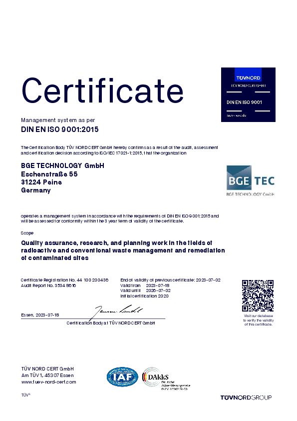 With the issue of the TÜV NORD certificate for the scope "Quality assurance, research, and planning work in the fields of radioactive and conventional waste management and remediation of contaminated sites", we have been certified as having a functioning quality management system. However, this does not mean that we have achieved our goal. We will continue to optimise our processes, adapt them to current circumstances and train the quality awareness of our employees so that we can continue to provide our partners and clients with our expertise in the future.