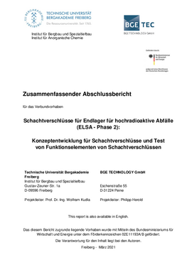 Kudla, W.; Herold, P.; et al. (2021): Zusammenfassender Abschlussbericht. ELSA - Phase II: Shaft closures for repositories for high-level radioactive waste: Concept development for shaft closures and testing of shaft closure functional elements. Technischen Universität Bergakademie Freiberg (TUBAF), BGE TECHNOLOGY GmbH (BGE TEC). Freiberg