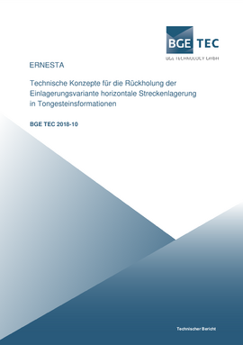 Herold, P.; Prignitz, S.; Simo, E.; Filbert, W.; Bertrams, N. (2018): ERNESTA. Entwicklung technischer Konzepte zur Rückholung von Endlagerbehältern mit wärmeentwickelnden radioaktiven Abfällen und ausgedienten Brennelementen aus Endlagern in Salz- und Tongesteinsformationen. ERNESTA: Development of technical concepts for the retrieval of repository containers with heat-generating radioactive waste and spent fuel elements from repositories in salt and claystone formations. BGETEC 2018-11. BGE TECHNOLOGY GmbH (BGE TEC). Peine