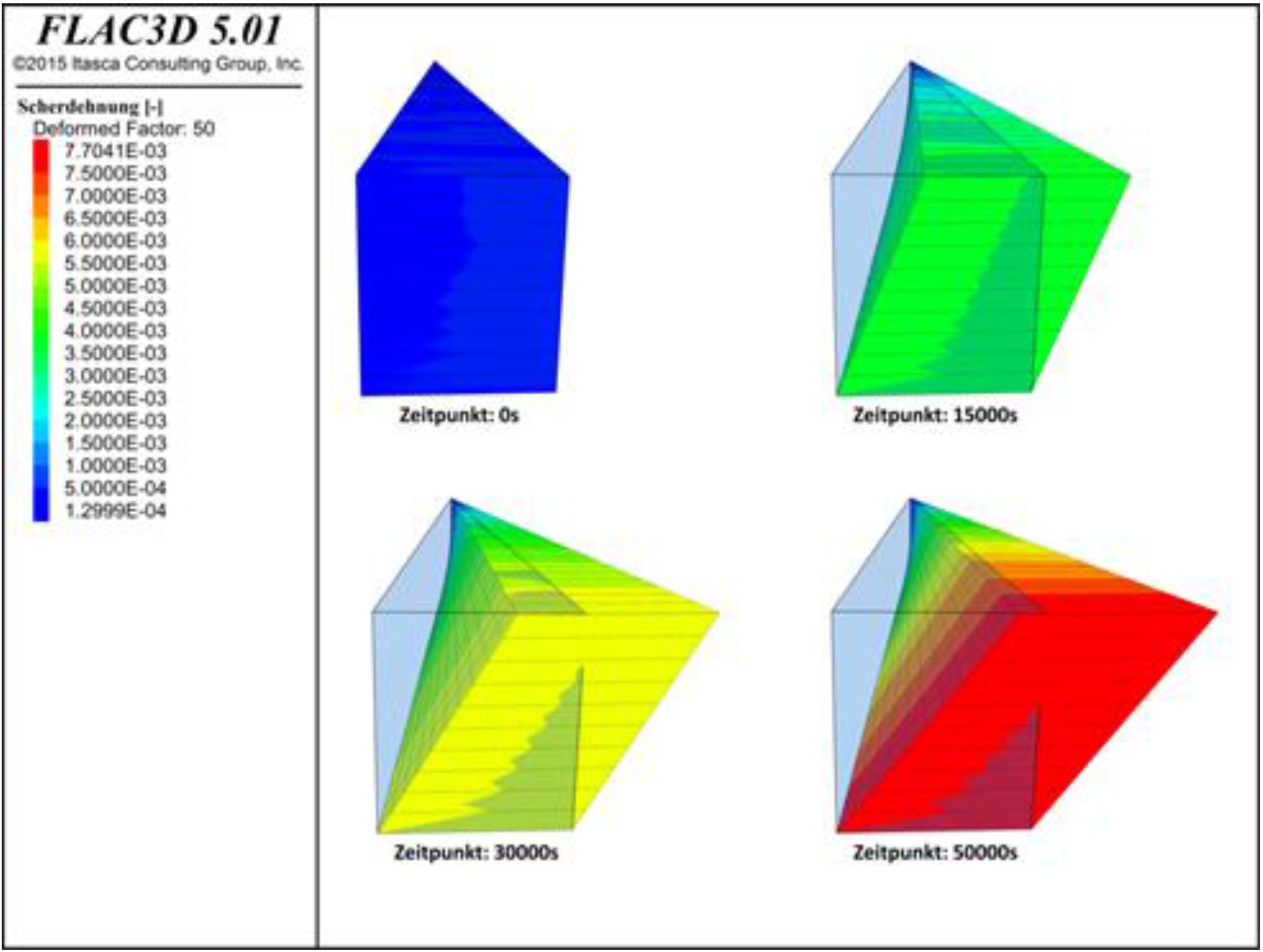 Mögliche Dichtmaterialien für Schachtverschlusselemente sind Bitumina bzw. Asphalt (= Bitumen mit mineralischen Zuschlagstoffen). Parallel zu den Labor- und In-situ-Versuchen der TU Freiberg, entwickelt die DBE TECHNOLOGY GmbH ein numerisches Modell, um das thermo-mechanische Verhalten des Materials zu simulieren und die Bedingungen bei der Errichtung der Dichtelemente zu bewerten. Das generelle thermo-mechanische Verhalten des Bitumens ist aus dem Bauwesen, insbesondere aus dem Straßenbau, bekannt. Das viskoelastische Verhalten von Bitumen kann mit dem Burger-Model beschrieben werden. Die Anforderungen und die Belastungen eines Schachtverschlusses unterscheiden sich dadurch vom Straßenbau, dass die Hauptlasten gleichbleibend und statisch sind sowie über lange Zeiten wirken, während dynamische Lasten irrelevant sind. Daher sind die Flüssigkeitseigenschaften des Bitumens wichtig und die Strukturviskosität ist zu betrachten. Das Modell wurde mit Hilfe eines Schertests kalibriert, der mit einem Parallel-Platten-Rheometer durchgeführt wurde. Im ersten Schritt wurde oxidiertes Bitumen bei verschiedenen Temperaturen untersucht. Ein kleiner Keil der Probe wurde mit dem Modell simuliert, wobei die Simulationsergebnisse gut mit den Versuchsergebnissen übereinstimmen. Einige Unterschiede ergeben sich daraus, dass die Strukturviskosität noch nicht vollständig in das Modell implementiert ist.