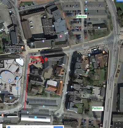 - Der Eingang befindet sich in der Schützenstraße gegenüber der Post