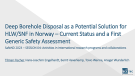 Fischer, T.; Engelhardt, H.; Haverkamp, B.; Wanne, T.; Wunderlich, A. (2023): Deep Borehole Disposal as a Potential Solution for HLW/SNF in Norway Current Status and a First Generic Safety Assessment. Vortrag im Rahmen der Konferenz SafeND 2023 vom 13. bis 15. September 2023 in Berlin, Deutschland.