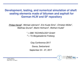 Herold, P.; Jobmann, M.; Simo, E.; Müller, C.; Gruner, M.; Hofmann, M.; Kudla, W. (2017): Development, testing, and numerical simulation of shaft sealing elements made of bitumen and asphalt for German HLW and SF repository. In: EPFL (Hrsg.) 7th Clay Conference (Clays in Natural and Engineered Barriers for Radioactive Waste Confinement). Davos, 24. – 27. September 2017. Lausanne. ELSA - Phase II: Schachtverschlüsse für Endlager für hochradioaktive Abfälle Konzeptentwicklung für Schachtverschlüsse und Test von Funktionselementen von Schachtverschlüssen. DBE TECHNOLOGY GmbH (DBE TEC), Technischen Universität Bergakademie Freiberg (TUBAF). Lausanne
