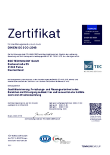 Mit der Ausstellung des TÜV NORD-Zertifikates für den Geltungsbereich „Planung von Endlagern, kerntechnischer und konventioneller Anlagen sowie deren Entsorgung, Altlastensanierung“ haben wir bescheinigt bekommen, über ein funktionierendes Qualitätsmanagementsystem zu verfügen. Das bedeutet für uns aber nicht, dass wir damit unser Ziel erreicht haben. Wir werden durchgehend unsere Prozesse optimieren, den jeweils aktuellen Gegebenheiten anpassen und das Qualitätsbewusstsein der Mitarbeiter schulen, um so in Zukunft weiterhin unseren Partnern und Auftraggebern mit unserem Know-how zur Verfügung zu stehen.